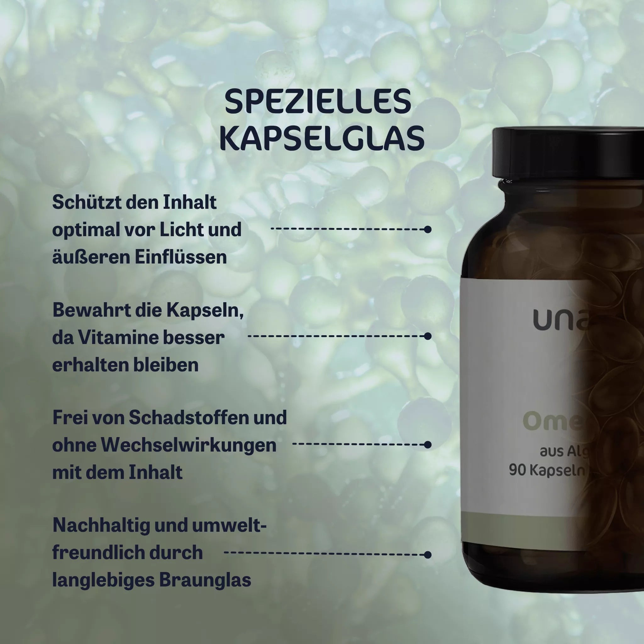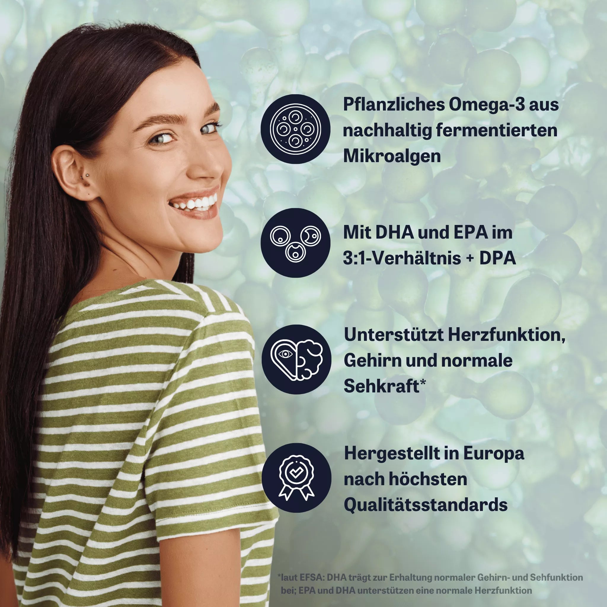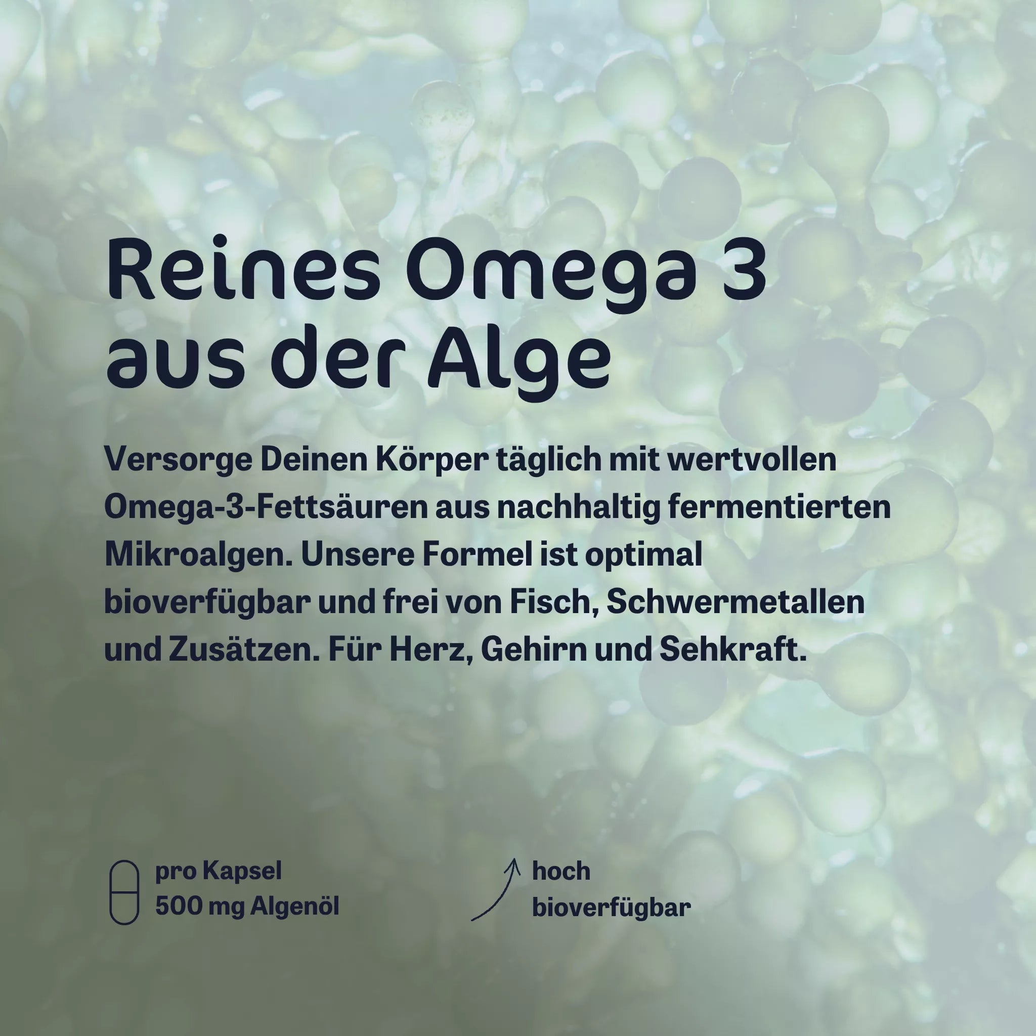 Omega-3-Algenöl (Algenöl aus der Mikroalge Schizochytrium sp., Antioxidationsmittel: stark tocopherolhaltige Extrakte, Rosmarin-Extrakt), Kapselhülle (modifizierte Stärke, Feuchthaltemittel: Glycerin, Geliermittel: Carrageen).