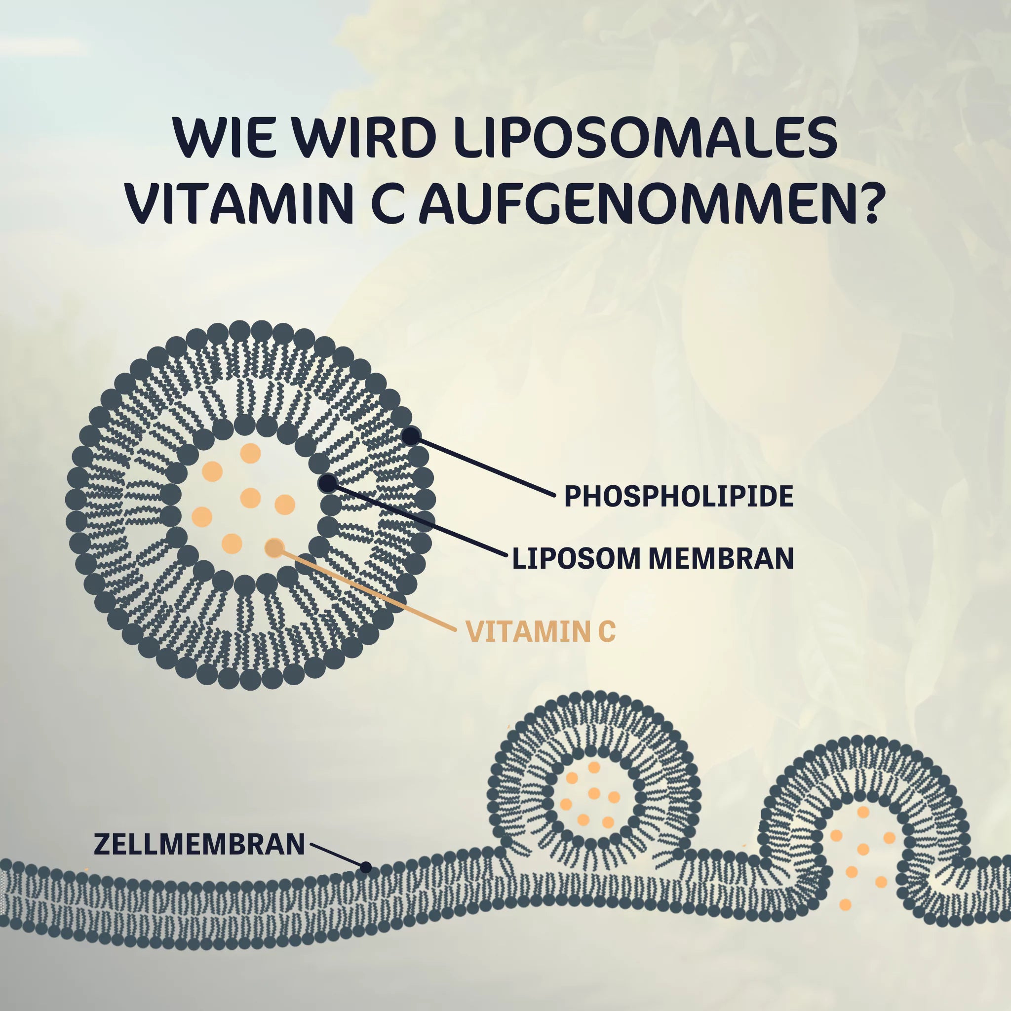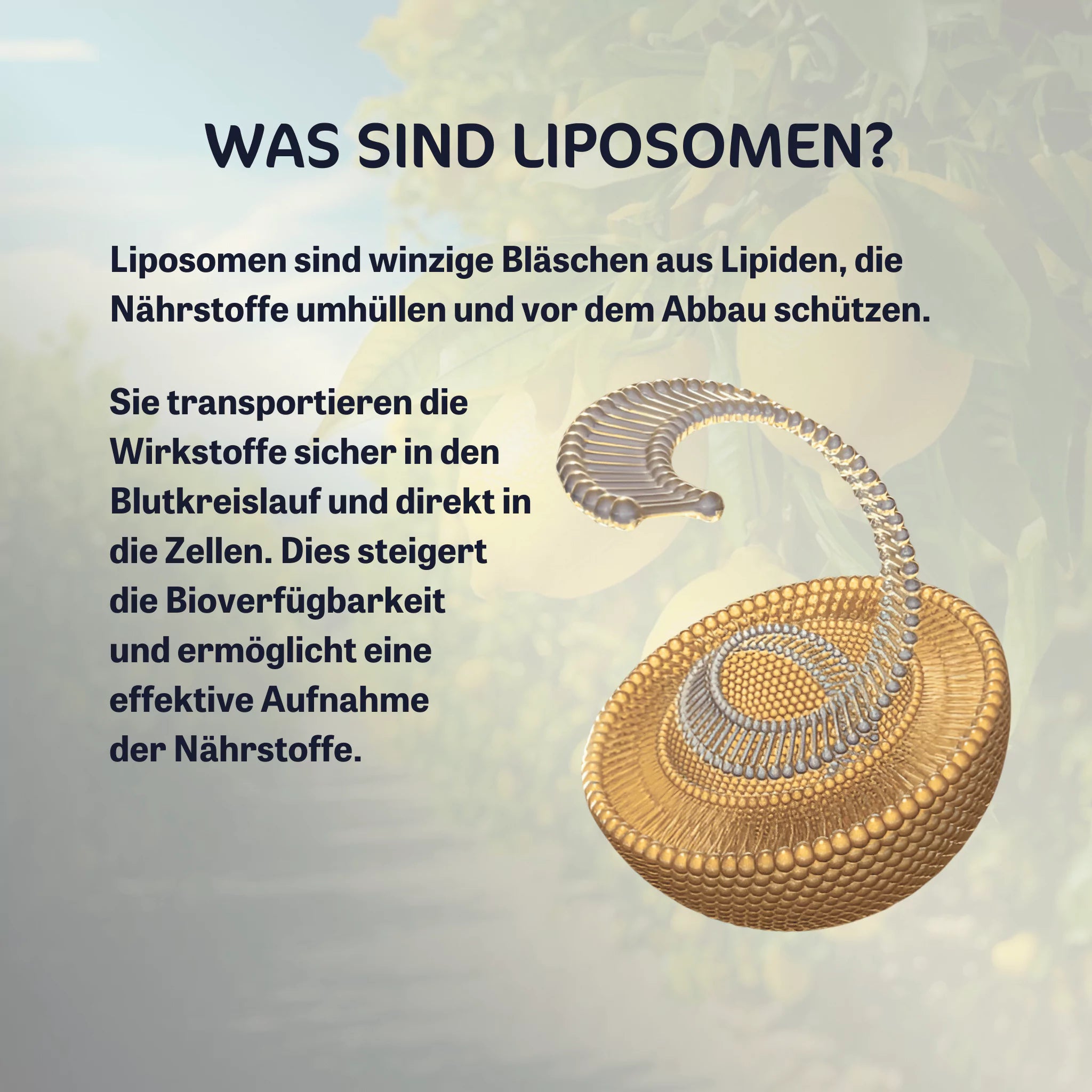 Ein Liposom ist ein winziges Fettbläschen aus natürlichen Phospholipiden, das den Nährstoff wie ein Schutzschild umhüllt. Dadurch bleibt der Wirkstoff vor der Magensäure und dem Verdauungssystem geschützt, bis er sicher und gezielt in die Zellen gelangt, wo er seine volle Wirkung entfalten kann.