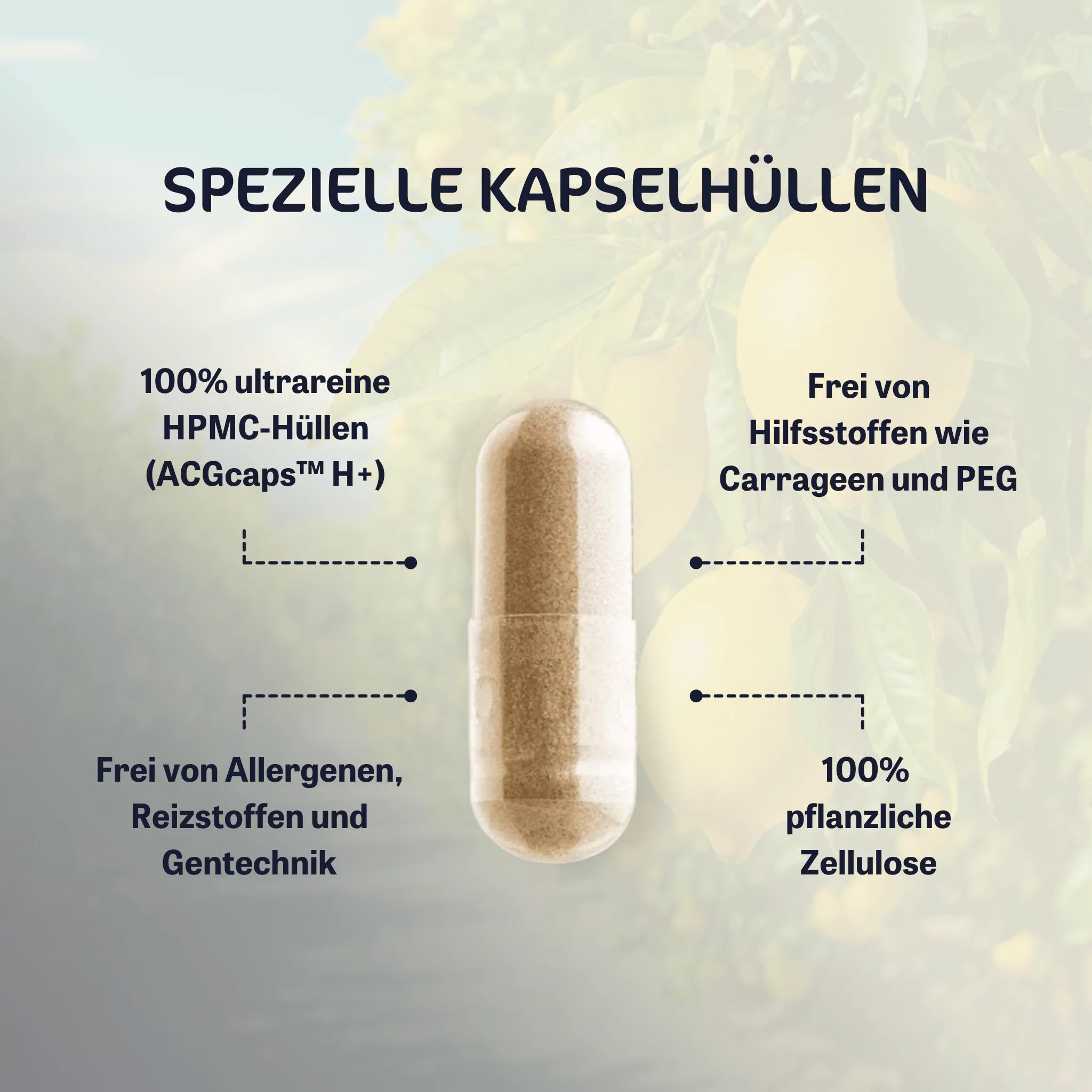 Liposomaler Vitamin C-Komplex (Vitamin C, Phospholipide, pflanzliche Fettsäuren, Citrus-Bioflavonoide), Kapselhülle: Hydroxypropylmethylcellulose.
