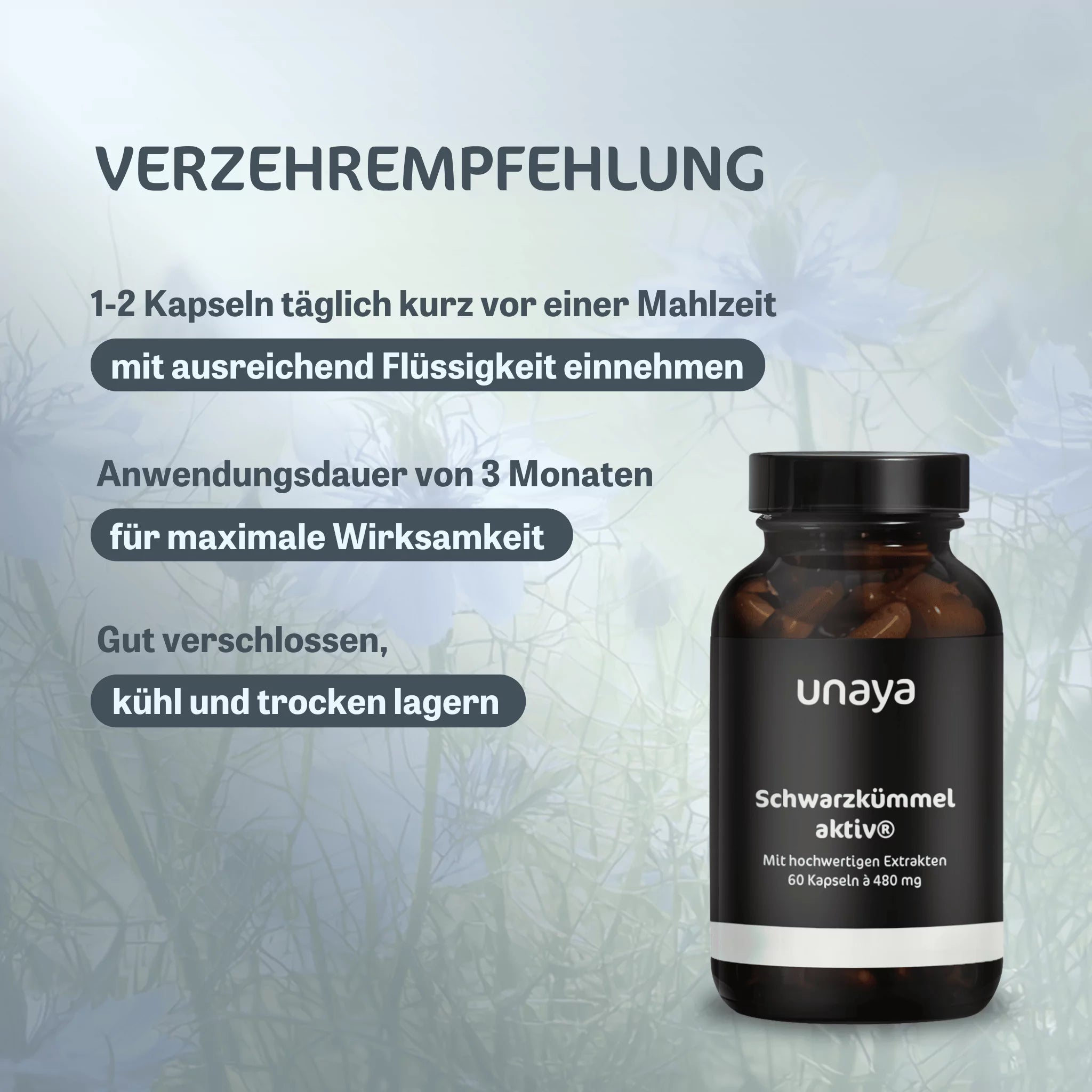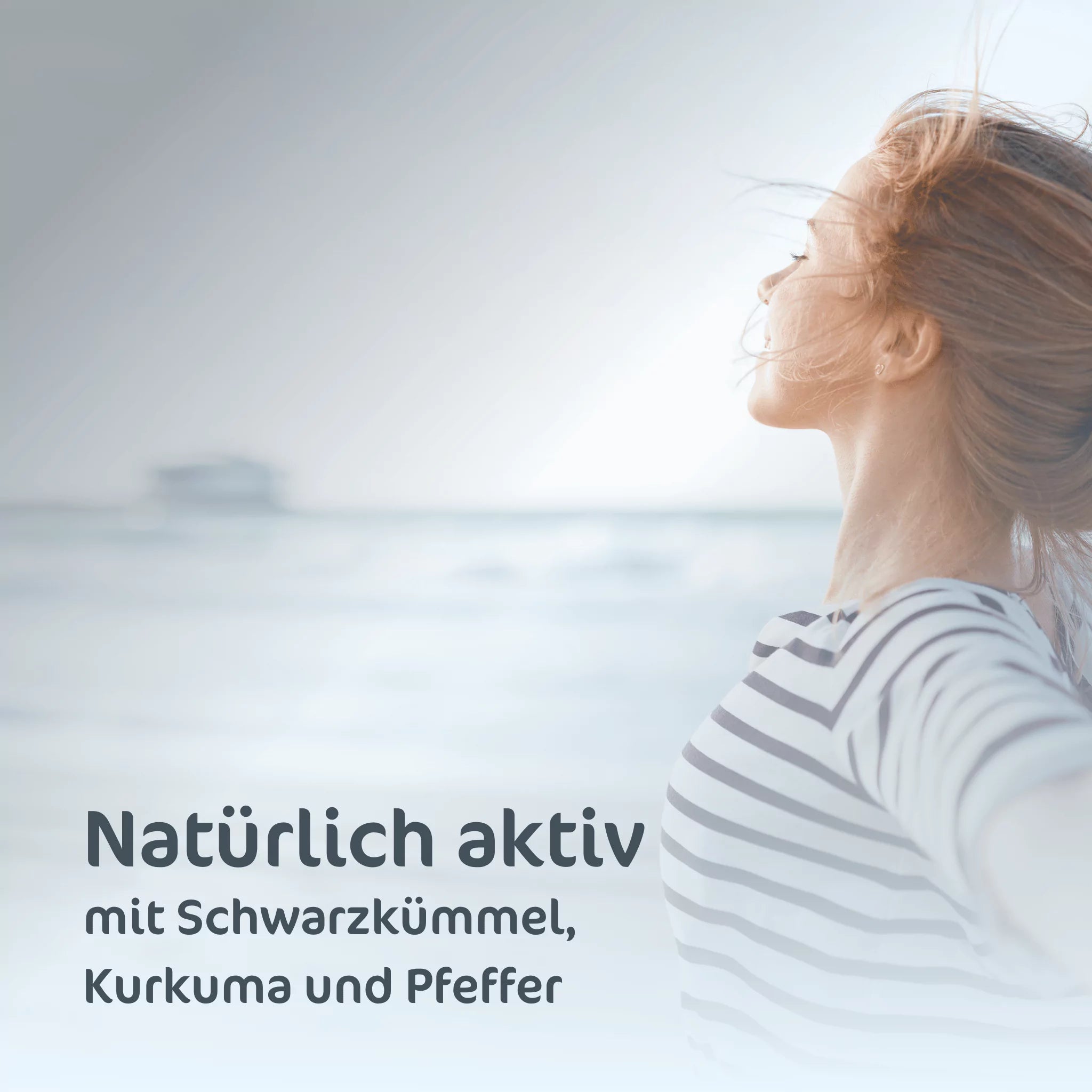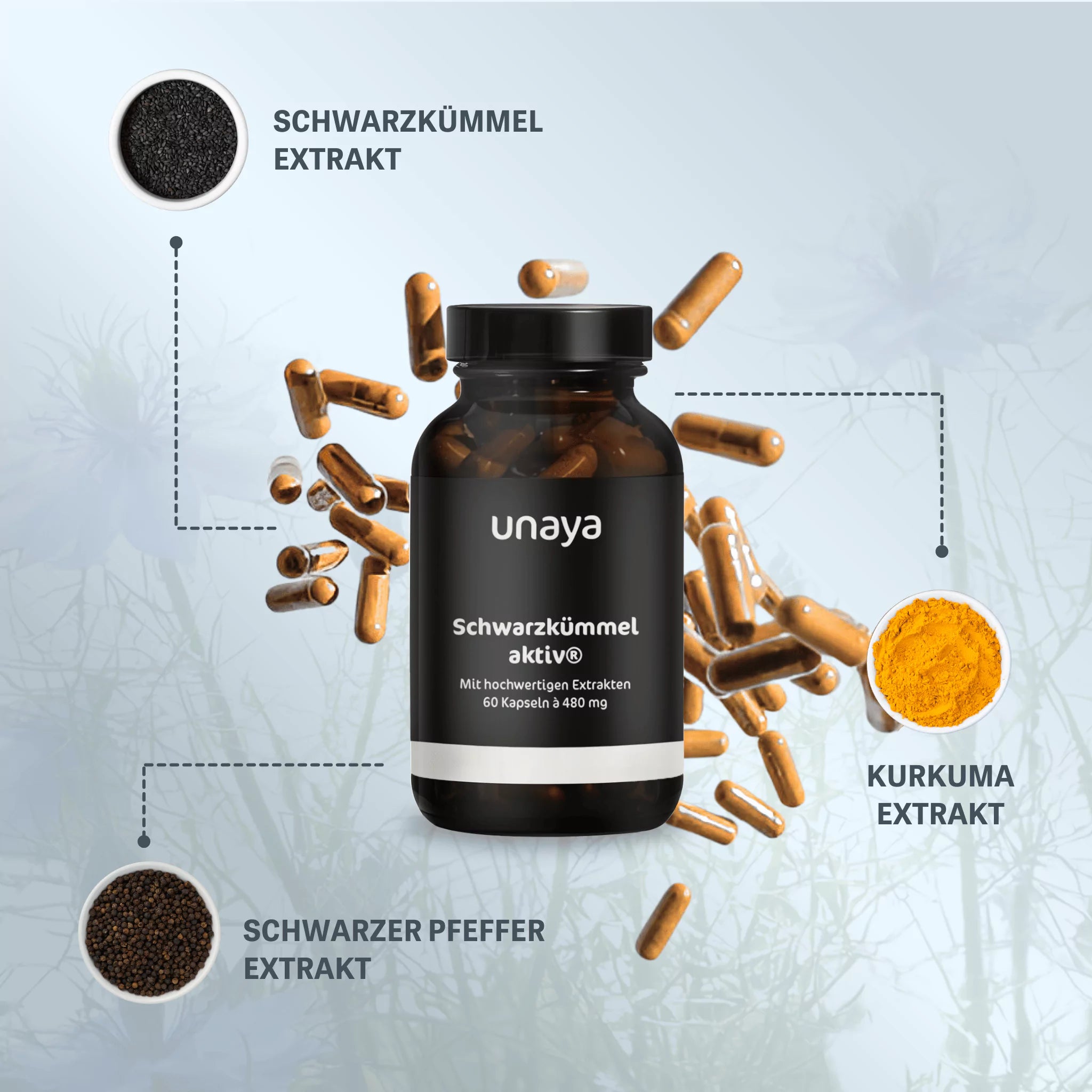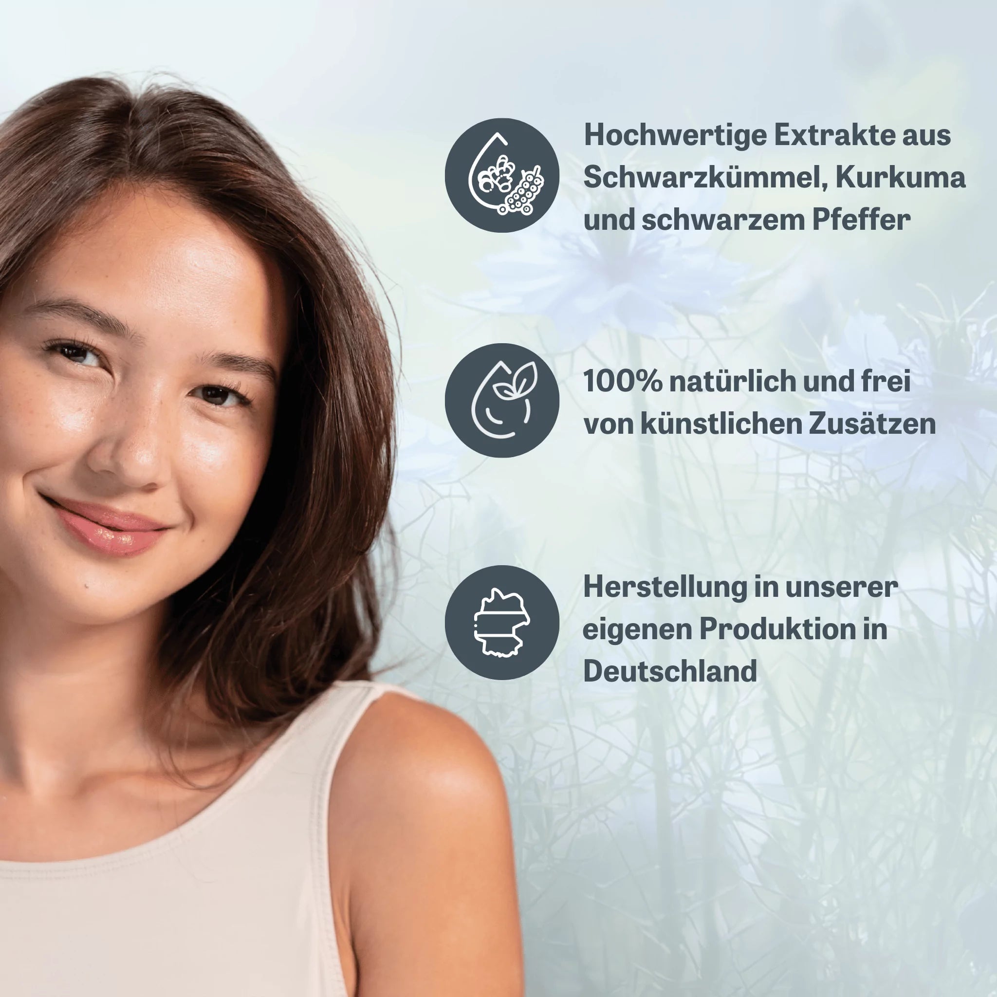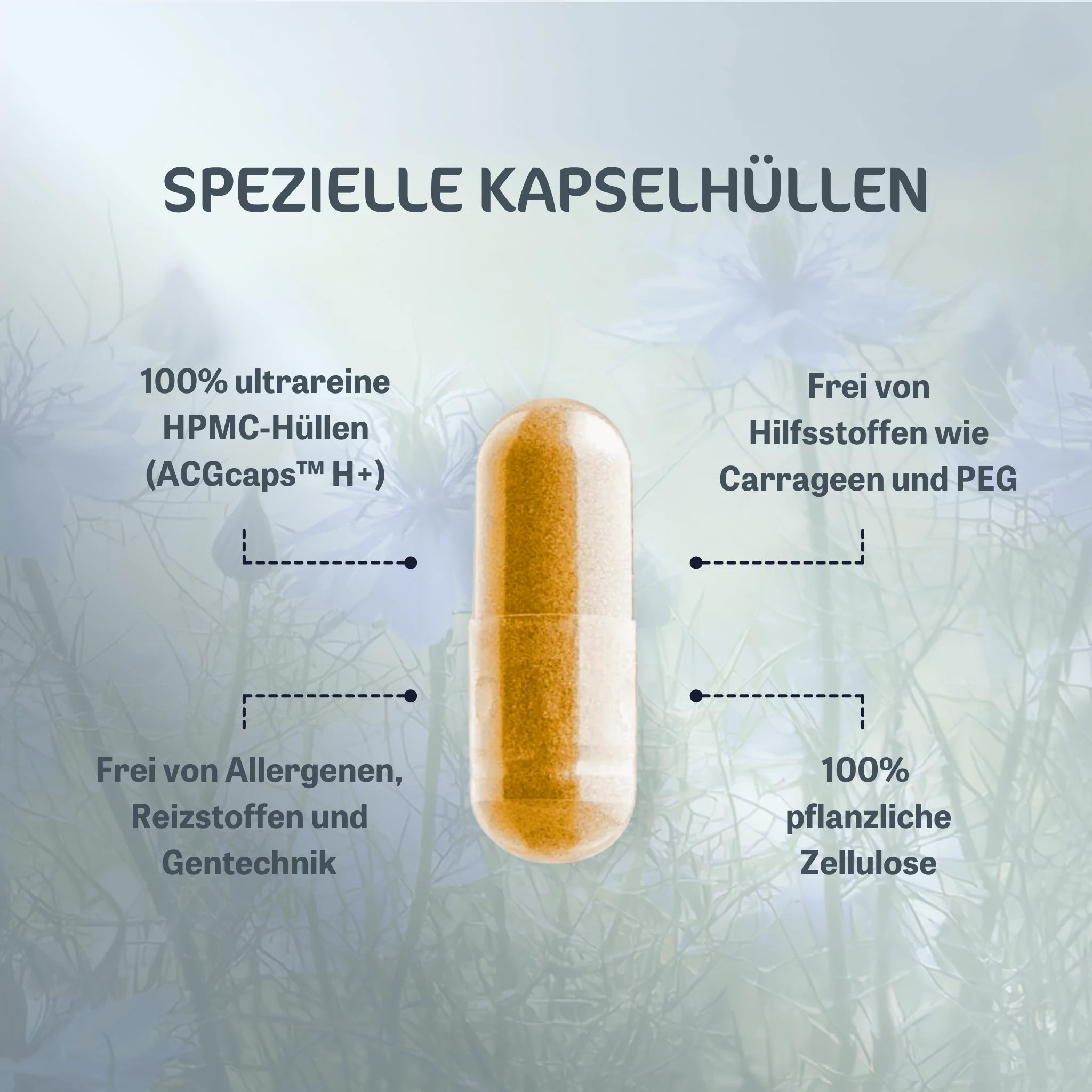 Kurkuma-Extrakt, Schwarzkümmel-Extrakt, Schwarzer-Pfeffer-Extrakt, Kapselhülle: Hydroxypropylmethylcellulose.
