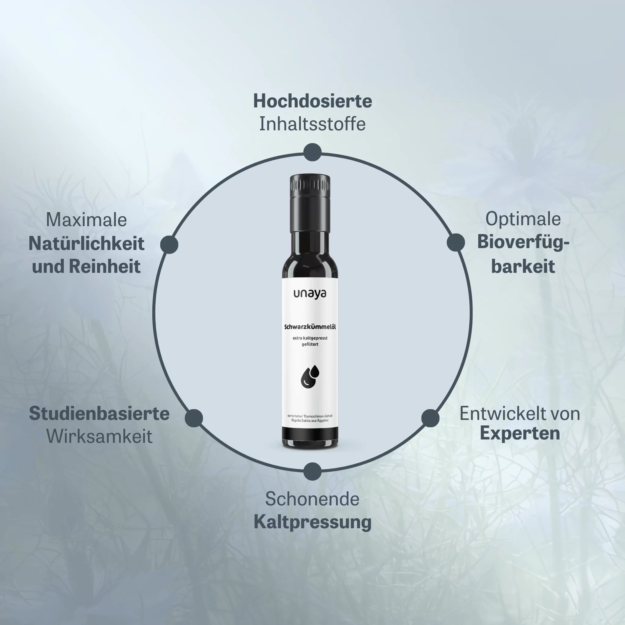 Schwarzkümmelöl überzeugt durch seine Vielfalt an wertvollen Inhaltsstoffen wie Thymochinon, ungesättigten Fettsäuren, Vitaminen und Mineralstoffen, die bereits in über 600 wissenschaftlichen Studien untersucht wurden. Dank seiner besonderen Zusammensetzung findet das Öl heute nicht nur in der Küche, sondern auch in der Kosmetik und modernen Naturheilkunde Anwendung. Mit den neuen wissenschaftlichen Erkenntnissen erlebt Schwarzkümmelöl eine Renaissance als vielseitiges Naturprodukt.