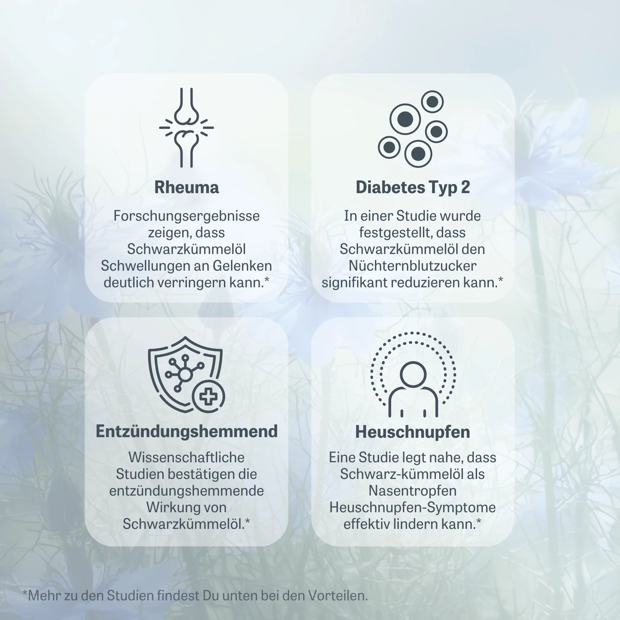 Forschungsergebnisse zeigen, dass die im Schwarzkümmelöl enthaltenen Wirkstoffe entzündungshemmend wirken können (siehe Studie).