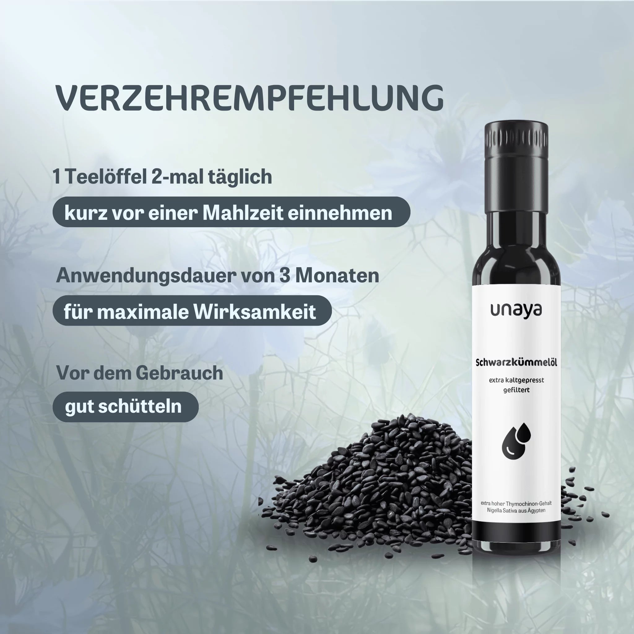 Schwarzkümmelöl wird in der Regel gut vertragen. Bei Unsicherheiten oder besonderen gesundheitlichen Bedingungen empfehlen wir, vor der Einnahme einen Arzt zu konsultieren.