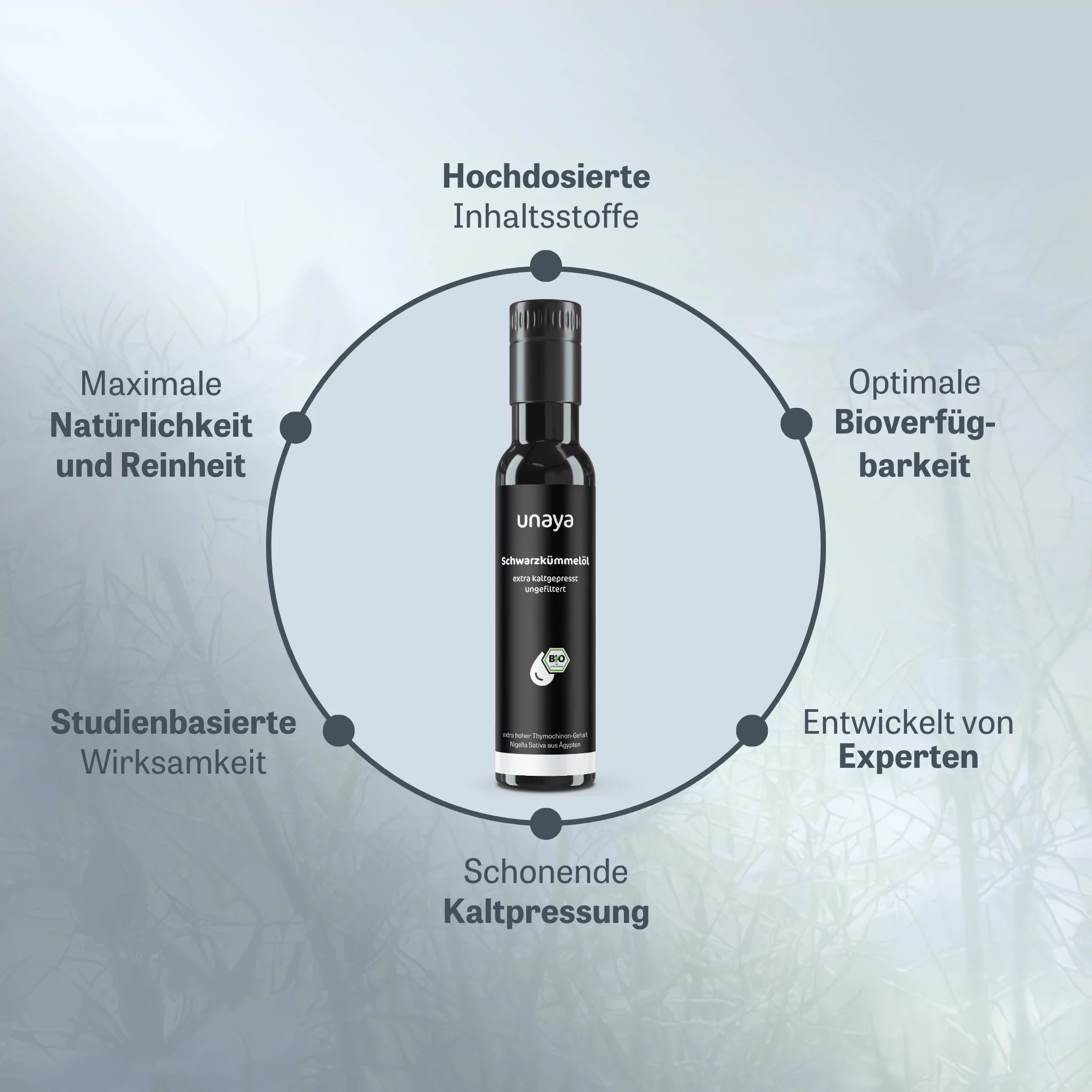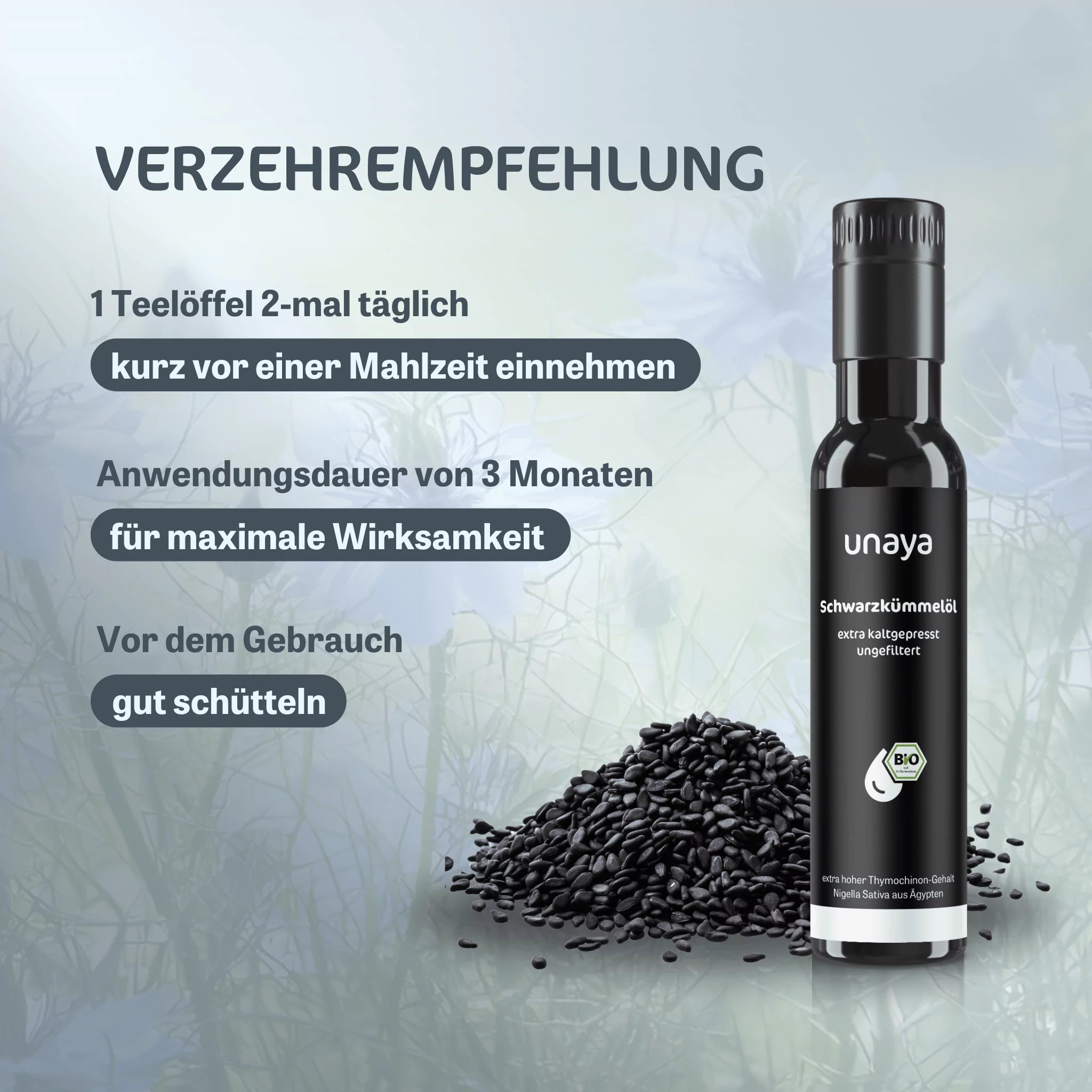 Die verwendeten Nigella-Sativa-Samen stammen aus kontrolliert biologischem Anbau in Ägypten, ohne den Einsatz von Pestiziden oder synthetischen Düngemitteln.